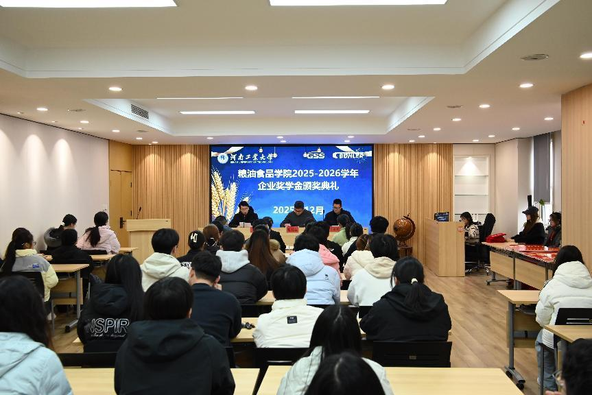 为表彰先进典型、激励学子奋进,深化校企协同育人成效,12月23日下午,河南工业大学粮油食品学院2025-2026学年捷赛奖学金颁奖仪式在惟实楼捷赛厅隆重举行。粮油食品学院党委书记张兴振、河南工业大学校友与基金工作办公室副主任王欣欣、学院各年级辅导员出席仪式。仪式由学院副院长刘伟主持。