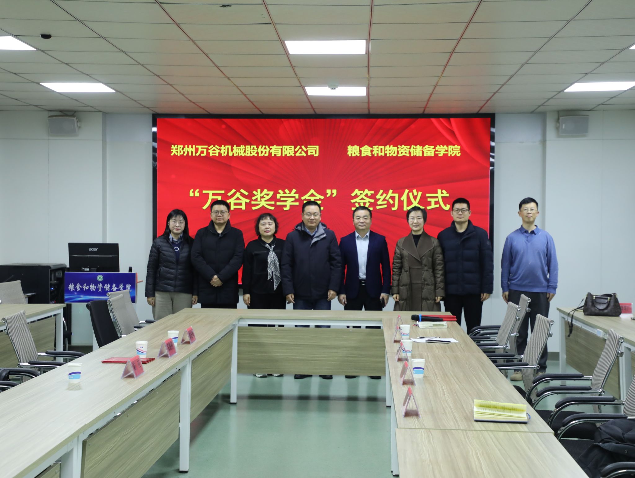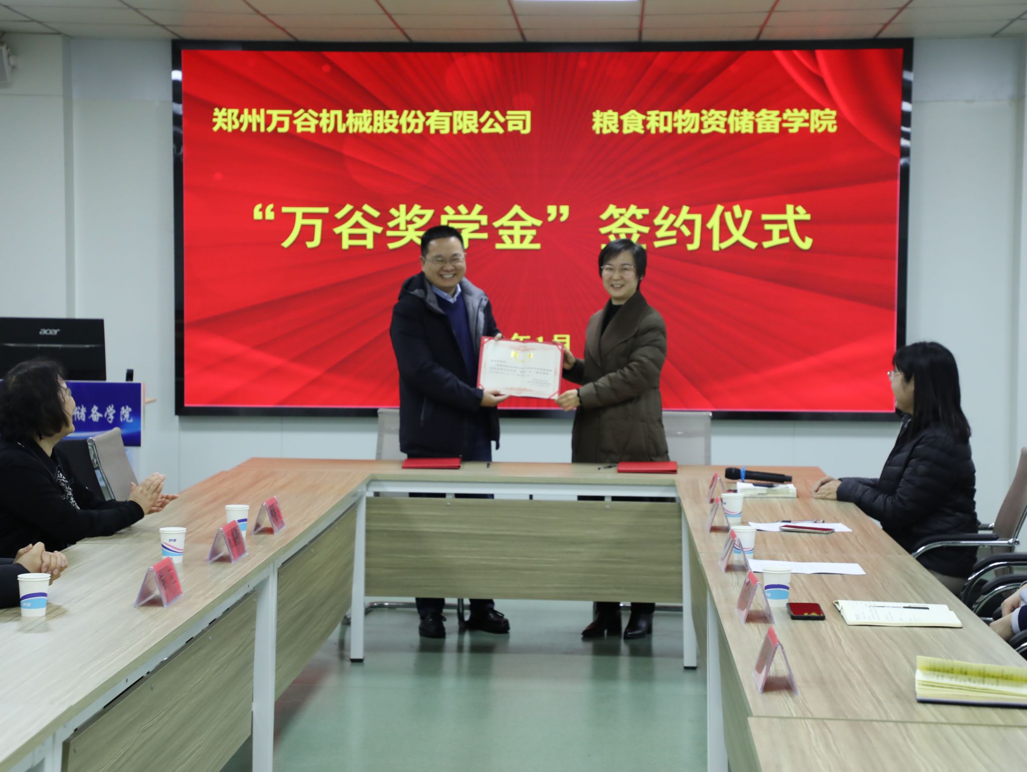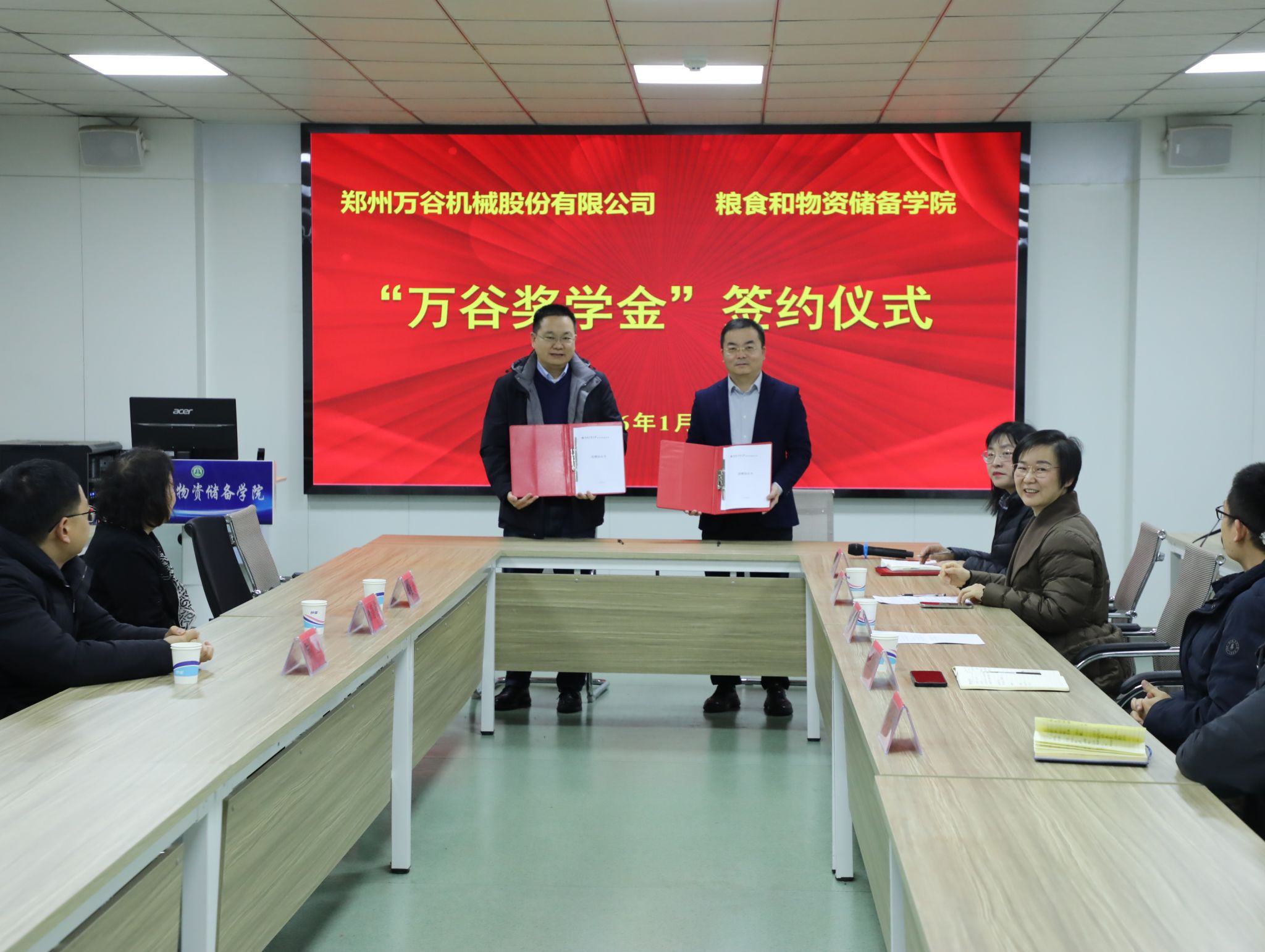 为深化产教融合、赋能人才培养,筑牢校企协同育人桥梁,1月19日,粮食和物资储备学院在崇实楼捷赛厅举行“万谷奖学金”签约仪式。郑州万谷机械股份有限公司副总经理张德榜、陆应,总工程师郭桂霞等三位校友,我校校友与基金工作办公室副主任王欣欣,粮食和物资储备学院党委书记代辉亚、党委副书记梁艳及师生代表共同出席。仪式由梁艳主持。
