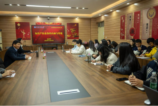 朱亚军结合多年丰富的实战经验,从知识产权确权用权、如何打造高质量专利、职业发展规划等方面,与大家做了分享交流。他详细介绍了知识产权业务的国家战略导向与发展前景,鼓励同学们关注知识产权业务发展,多参与知识产权工作实践,尽早与就业岗位工作职责衔接,为毕业后顺利就业奠定坚实基础。他强调,专业能力是将来迈入社会、站稳脚跟的“基石”,希望同学们尽早获得职业资格证书,顺利跨越资质门槛,努力实现高质量就业。随后,朱亚军与在场研究生进行了互动交流,校友情谊在真诚的一问一答中得到完美呈现。